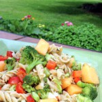 - While the pasta is still hot, stir together the pasta, tomatoes, broccoli, red pepper, basil, dill, lemon juice, and cantaloupe. Salt to taste.