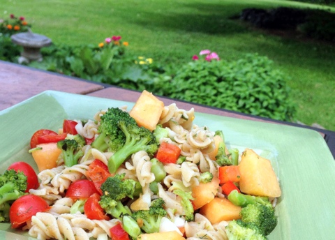 - While the pasta is still hot, stir together the pasta, tomatoes, broccoli, red pepper, basil, dill, lemon juice, and cantaloupe. Salt to taste.