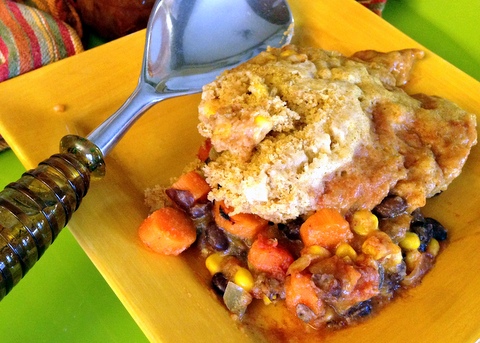 We love one-pot meals like this Mexican Skillet with Corn Dumplings. The corn dumplings are hearty and satisfying, made with corn flour rather than corn meal. We’ve also added corn kernels to the mix for even more texture and interest. The dumplings go so well with the savory, stew-like base of beans and vegetables. If you have trouble finding corn flour at your local grocery store, you can find it online on Amazon. We’ve used Bob’s Red Mill corn flour each time we make this, but you could use Masa Harina, a corn flour treated with lime and used to make corn tortillas. If you do, let us know how you like it, we haven’t tried that yet. Or, you can substitute the 1 cup of corn flour with 1/2 cup of corn meal, and add another 1/2 cup of whole wheat pastry flour to the mix.