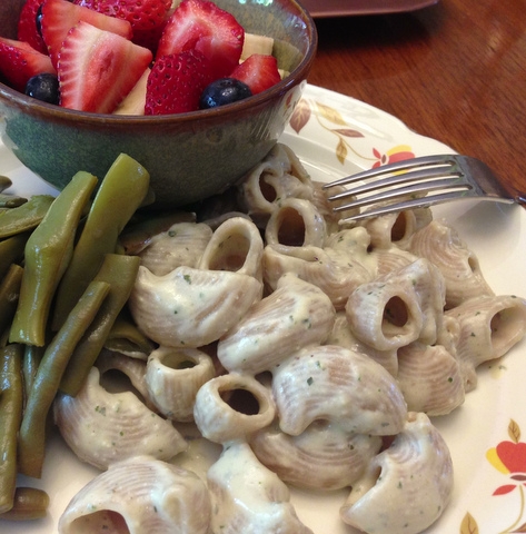 This Pasta with Creamy Basil Sauce is a great dish for special occasions or company, because it tastes like you worked on it all day, but you didn’t. So you’re not too tired to spend a lively evening with your guests. The all-important sauce goes together quickly with the help of a food processor and ready-made hummus – the secret ingredient. The sauce is something like a blending of pesto sauce (providing that sweet, basil flavor) and alfredo sauce (providing that rich, creamy mouthfeel). But it’s all plant-based, of course.